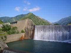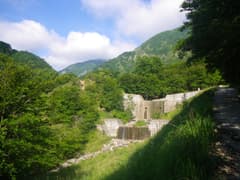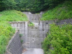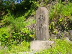 この導水橋は太い鋼管の上に通路を設けたものだ。対岸に渡ると水門と小さな溜め池があり、青く澄んだ水が導水橋の鋼管に勢い良く流れ込んでいる。傍らには水神の石碑があり、昭和五年建立とあるから、これらは足尾銅山の遺構の一つのようだ。