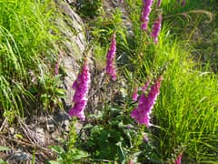 道路の右側は、石塔尾根末端の横場山(1016.8m三角点峰)の山腹で、鉱害で木が枯れて荒れた急斜面となっている。その斜面のあちこちにピンクの大柄な花が群れて咲いており、目を惹く。道路脇にも咲いていたので、撮影して後日調べてみるとジギタリスらしい。強心剤として薬草になるが猛毒で、欧州原産の外来種だ。栽培物が持ち込まれて野生化したのかな。繁殖力が強いそうで、今後、この辺り一帯に蔓延りそうな予感。