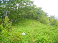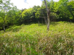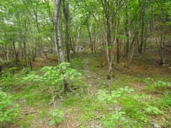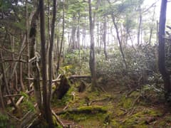段差を越えると針葉樹林と笹原に覆われた台地状の稜線となる。笹原の間に縦横に通じる鹿道を歩くが、シカの丸っこいフンがびっしり落ちていて、フンづけざるを得ない。乾燥しているので、土塊と同じと思うシカない。