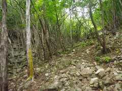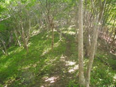 踏み跡を辿ると、急な所には手摺にトラロープが張られたりしていて、かなり歩かれている様子がある。右手の小尾根を乗っ越して浅い谷に入り、樹林に覆われた急斜面を登る。踏み跡は明瞭で、赤テープを注意深く追って行けばルートを失う心配はない。ジグザグを切って登るので体力的にも楽で、道標があれば一般登山道と言っても良いレベルだ。