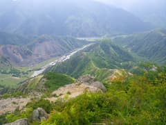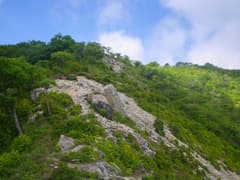 踏み跡は小鞍部から尾根を直登せず、山腹を右にトラバースする。横場山から縦走して来るとこの辺りに登り上げるはずだが、どこもかしこも樹林に覆われた急斜面でルートは判然としない。やがて展望の良い岩稜に出て、横場山や三川合流が一望できる。振り返って見上げると、中倉山の頂上稜線はすぐそこだ。