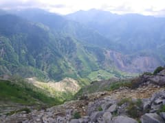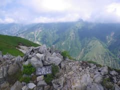 三角点から緩く登ると樹林が切れて一面笹原の稜線となり、ケルンのように石が積み重なった中倉山の頂上に着く。頂上からの展望は正に360度で素晴らしい。西側には笹に覆われた石塔尾根がゆるやかに延びて、沢入山やオロ山に連なる。北側は松木川に向かって崩壊した急斜面となり、谷底には旧松木村辺りの平地を見おろす。松木川の対岸の稜線は雲の中だが、半月山が大きな山容を見せている。