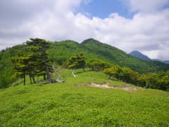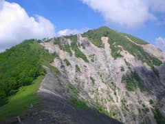 眺めを楽しみながら稜線をゆるゆると下り、鞍部から広い笹原と砂礫地の境界をゆるゆると登る。笹原の中には鹿道がくっきりと何本もついている。陽に照らされた笹原の緑が鮮やかで綺麗だ。