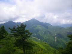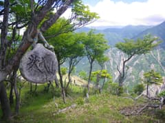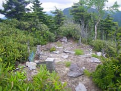 頂上には「山」標石があり、古びた山名標と日光山紀行の新しい山名標が木の枝に掛けられている。疎らな樹木が眺めを遮るが、少しオロ山に寄った所から眺めが開けるので、ここで休憩する。行く手には台形のオロ山を中心にして、右に皇海山、左に庚申山が眺められる。特に皇海山は夏雲の中に頂上を突っ込んでひと際高く、さすが名山の風格がある。その右には松木渓谷を隔ててカマ五峰から三俣山にかけての稜線が眺められる。昨年秋に縦走したので、懐かしい。