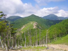 急坂を登り岩稜を越えると、沢入山の手前のピークに着く。左の仁田元沢側は緑の絨毯のような笹原と疎らな樹林、右の松木川側は灰色の崩壊斜面だ。対照的な景観を見ながら稜線を緩く上下すると、沢入山の頂上に着く。