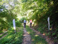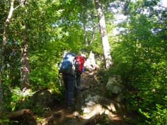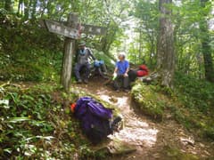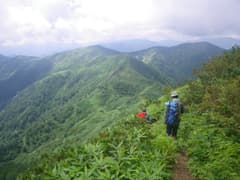 小尾根の登りが尽きた所が鷹ノ巣峠で、先行のご夫婦が休憩していた。話を伺うと今日は赤湯温泉泊とか。かなり羨ましい。ここから緑深い樹林のトラバースとなり、見返りの松という標識のある地点に着く。この地点では携帯が使えて(私のdocomoで確認)送迎のタクシーの案内看板がある(越後湯沢駅まで約50分、8,200円〜)。