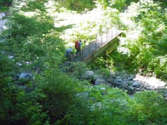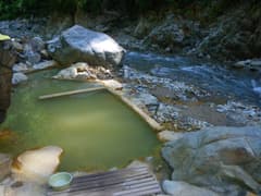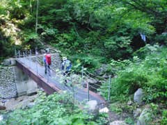 道は下りとなり、最後は急斜面をジグザグに降りて赤湯一号橋で川を渡る。続いて二号橋で清津川本流を渡り、右岸に沿って進むと赤湯温泉の3つの露天風呂がある。褐色の温めの湯で、渓流に面して野趣満点。これはいずれ入りに来なくては、と皆の意見が一致する。
