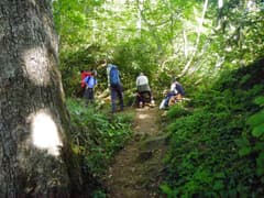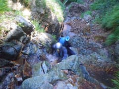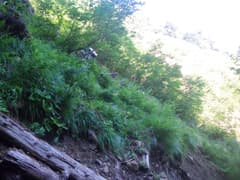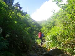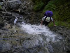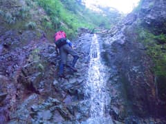 ぐんぐん高度を上げると、4m程の滝が現れる。これは直登不能で、右から高巻くしかなさそうだ。ここで初めてヘルメットを被る。まず、Mさんが高巻きルートにチャレンジする。脆い急斜面で、登る足元から大石がガラガラ落ちる。間隔をあけて、次に私が登る。水が流れる溝を登ると低木の藪となり、木の枝と草を摑んでトラバース。滝の上に出て草付きを降りる。最後にHさんが無事に高巻き。小さく巻けて良かった。この高巻きが今回の沢登りの一番の難所となる。