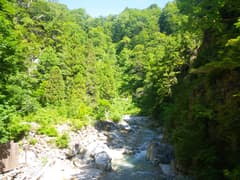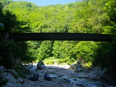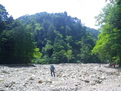 赤湯温泉から河原を歩くと昌次新道入口の鉄橋があり、ここで渓流足袋に履き替えて遡行を開始する。対岸で何か採取中の男性がいたので、声をかけて話を伺うと、山口館の館主の方だった。夕食の天ぷらにする山菜を採っていたとのこと。美味しそうだなあ。