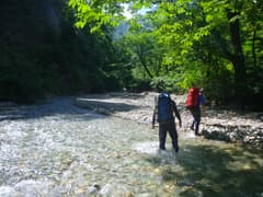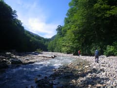 途中、川幅の狭くなるところもあるが、平坦な河原歩きがほとんど続く。左にセバト川を分け、一段と河原が広くなると正面から西ノ沢が出合い、本流は左に屈曲する。ここでパンを食べて一休みする。