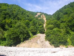 金島駅から中山峠、三国峠を越え、苗場スキー場の前から赤湯温泉入口への林道に入る。すぐに未舗装道となり、曲がりくねった道を延々と走る。清津川を渡る小日橋で車両通行止めになっているが、工事用バリケードが置かれているだけなので、ちょいと脇にどけて進入する(もちろん、何かあっても自己責任で)。