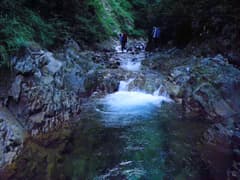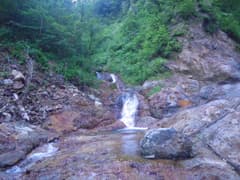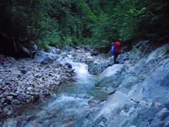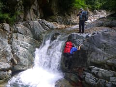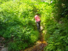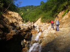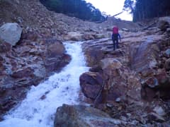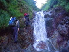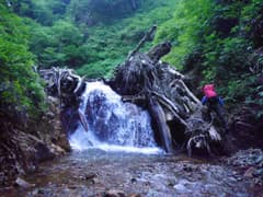 やがて最初の滝らしい小滝が現れる。これは左から取り付き、水流中のガバホールドを利用して越える。この滝の上流の両岸はボロボロの草付きの急斜面で、沢には土石や流木が多く荒れ気味だが、ところどころにナメと小滝が現われ、沢登りらしくなってくる。