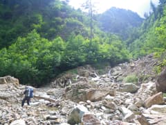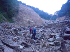 やがて膨大な土石に覆われた広い谷に出る。右岸の山腹が大規模に崩壊しており、これが谷を埋めてしまったようだ。半ば土砂に埋もれたナメ滝を越えると、大きな流木が絡まり合って谷を塞いでいる。この奥には、土砂と流木で塞き止められた小さな湖があった。