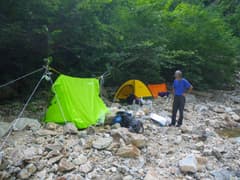 小さな砂地を見つけて、まず、Mさんの2人用テントを張る。Hさんか私のどちらかはテントで寝れば良いのだが、今晩は雨は降らなさそうだし、ツェルト泊を一度やってみたいということで、2人ともツェルトを張ってみる。立ち木が利用できればツェルトを張るのは簡単で、エアマットを敷いてシュラフカバーに潜り込めば、結構快適だ。