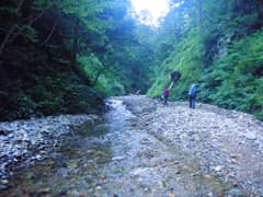 清津川は広大な河原が続く。水流は少なく、せいぜい膝下くらいしかない。清津川に何回か来たことがあるMさんによると、今日は水がかなり少ないようだ。しかし、徒渉で緊張せずに済むのは楽だし、周囲の原生林の緑を眺めながらジャブジャブと川を渡るのは涼しくて快適だ。右から土砂を大量に押し出した赤倉沢が出会う。Mさんはこんな沢も登ったことがあるというのだから凄い。