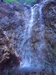 流木が引っかかってできた滝が多いが、深い釜を備えた綺麗なナメ滝もあり、なかなか美しい渓谷だ。途中、左の崖から赤錆色の水が湧いている個所がある。この水を嘗めてみると、鉄錆の味が強くした。このせいで、付近の河原は赤錆色に染まっている。