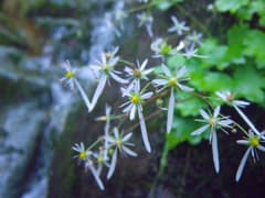 高巻き後も傾斜の強い沢を登る。次の小滝は登る途中で一歩のスタンスが遠い所があり、苦労する。ホールドをしっかり摑んでエイヤッと登る。ちょっと強引だったかな。さらに小滝が連続するが、いずれも問題なく登れ、水際に咲く花を愛でる余裕も出て来る。やがて水が少なくなって溝状の沢となり、もう滝はなさそうだ。振り返ると苗場山辺りの山が遠望できる。