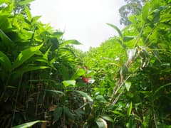 細い水流が合わさる二俣で一休み。ここで2ℓポリタンを満タンにしておく。右の水流を辿り、両側から草木が覆い被さる溝を登る。程なく笹藪に突っ込んで水がなくなったので、短靴(私はトレラン用シューズ)に履き替える。涸れた溝を頼りに深い笹藪を漕ぐ。ここが一番の頑張り所だ。