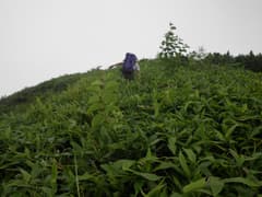 気がつくと先頭を行くMさんも、しんがりを歩くHさんも笹藪の中で見えない。ヤッホーと声をかけながらペースを落として登る。と言ってもこんな笹藪、速く歩ける訳がない(^^;)。振り返ると、上越国境稜線上の山々がほぼ目の高さで、たいぶ高度を稼いだと慰められる。