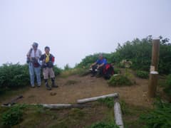 頂上には2人連れの登山者がいて、Hさんが面識があったことから、なんと「Tomoの奥利根山歩き」のtomoさんと「まきまきの写真集」のまきまきさんであることがわかった。よく見ていた山のHPなので、そのオーナーさんに山で出会ってビックリ。お二人は写真撮影を主目的に登られていて、とても立派なカメラをお持ち。あらぬ方向から笹を搔き分けて出現した我々には驚いたそうだ。キュウリの浅漬けと冷えた梨をいただいて、美味しさに感激。この後の下りも長いので、しばらく休憩する。