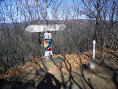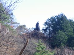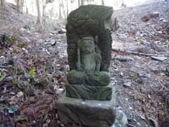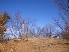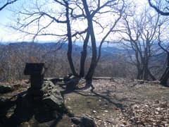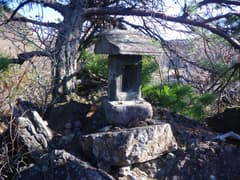 参道を下り、女人禁制碑からちょっと枝道に入って、稜線上の踏み跡を辿る。パサパサと松の生えた小ピークに着くと、小さな石祠がある。側面には「小天狗叶花村 寛保…六月…」と刻まれている。小天狗があるということは、どこか近くに大天狗もありそうだ。それにしても風が強く、手震れしないように写真を撮るのに苦労する。