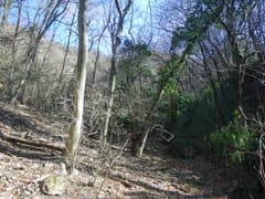 藪はごく薄いが踏み跡も薄く、そもそも道があったかのかどうかも怪しい。しかし、ぽつぽつと赤テープがあるので、稀に好事家が歩いているようだ。窪を登ると正面に岩場が現れるので、これは左へ巻く。