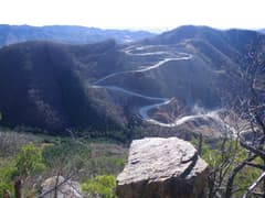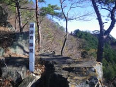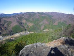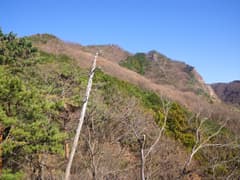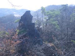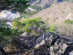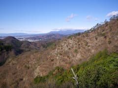 稜線は小ピークで右に折れ、採石場に向かって岩稜となって急角度で落ちている。岩稜上には踏み跡が続き、先程のハイカーさんはここを下ったようだ。隣には参道が通る尾根が眺められる。岩場が多くて、意外と険しそうに見える。尾根の向こうには御嶽山(姥穴山)や吾妻山、遠くには赤城山が眺められ、なかなか良い景観だ。