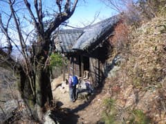 釈迦岩の左側を簡単に登って北側に抜け、ざらざらの岩屑を踏んで稜線を急登すると、僅かな距離で石尊山の頂上に着く。あらぬ方向から登り着いたので、居合わせた年配のハイカーさんに、どこから登って来たのか、と驚かれる。まずは頂上の石尊宮にお参りする。老朽化で表戸が外れており、中が丸見え。風雨が降り込んで老朽化が加速するのではないかと心配になる。