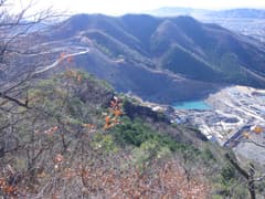 石尊宮の前は切れ落ちた斜面で、眼下に広大な採石場が広がる。手前には釈迦岩から落ちる岩稜も見えるが、かなりの急勾配だ。あそこを下るのはちょっと怖そう。