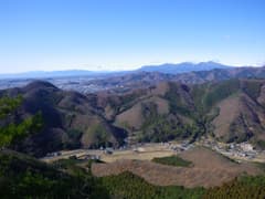 尾根道を石尊山に戻り、下山はノーマルルートで参道を下る。展望が良く、小俣川沿いの集落を俯瞰し、白葉峠から仙人ヶ岳にかけての山稜や遠くの赤城山を望む。