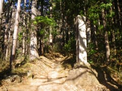 参道を辿ってすぐ左手の高台に麓の石尊宮があり、登り口に「三丁目」の標石がある。なお、「壹丁目」の標石が登山口の常夜灯の近くにあり、頂上が二十八丁目となる。