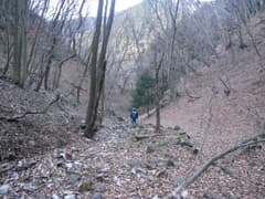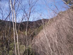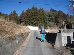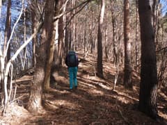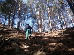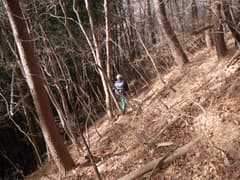 昼食地点のピークから東へ落ちる枝尾根を下ってみた。疎らな雑木林で歩き易いが、道型はない。林道に突き当たって擁壁の上に出たので、引き返す。