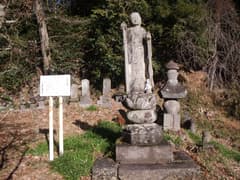 登り口から山に入ってすぐの右手に、石塔や石仏が集まった一角がある。一際背の高い端正な石仏は、三郎兵地蔵(延命地蔵菩薩)という。説明板によると、名主松島三郎兵衛が父母追善供養のため元禄二(1689)年に造立したもので、高さは2.4mあるとのこと。