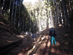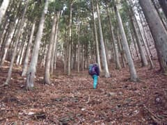 作業道を辿って、奇麗に枝打ちされて高く育った杉林の中を歩く。谷止工の堰堤を過ぎ、この辺りに大杉があるはずだが、見当たらない。山腹を巻き気味に登っていくと作業道は終点となり、そこから稜線に向かって杉林の急斜面を登る。