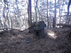 登り着いた稜線の上には、ぽっかりと深い一つの穴が開いている。何かの鉱山の跡だろうか。稜線を右に辿って少し登ると、三峰山の頂上に着く。樹林に囲まれて展望はなく、木の間を透かして栗生山が見える程度だ。頂上には一基の石祠があり、安永八己亥(1779)十一月吉日と刻まれている。