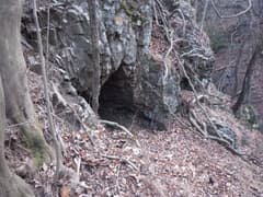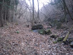 この沢をしばらく遡る。落ち葉がふかふかに積もっており、その下にわずかだが水流があるので歩きにくい。右岸の山腹にぽっかりと開いた穴があるので、登って覗いてみる。かなり深い横穴が開いている。これはマンガン鉱の採掘跡らしい。