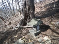 林道の分岐点の広くなった所に車を置いて、沢沿いの林道に入る。梨ノ木泊橋を渡り、堰堤の手前で右から出合う沢が峠道の登り口らしい。とは言っても、道型は全く残っていない。沢の中の台座の上に「寛政…四月…村中」と刻まれた石祠が祀られている。沢の上流を向いていて向きが変なので、本来は別の場所にあったものかも知れない。