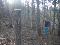 小中側の峠道は見つからなかったので、次は田沢側の峠道を探索する。石祠の少し南の稜線上から田沢側に下る道型を見つけた(入口の木に黄色テープを巻いた)。下り始めは道型が比較的はっきりしているが、杉林の斜面の途中で不明となる。杉林の中を下ると、登りと同じ沢の上流に着いた。すぐ上に林道が通っているのが見える。落ち葉に埋もれた沢を下って、石祠のある登り口に戻った。