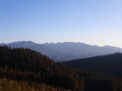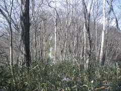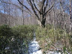 この山道は、道型は一応続いているものの、杉の植林帯の中に消えたり、笹藪に覆われたりして、明確なものではない。また、作業道や獣道が錯綜し、うまく利用するとピークが巻けて効率的だが、うっかり引き込まれて尾根から離れてしまうこともあり、進路選定に気を使う。基本的には尾根をずっと辿る。樹林に覆われ、展望は木の間越しに限られる。