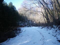 山道から林道に出て、ホッと一息。空はいつの間にか灰色の雲に覆われていた。明日は関東地方に大雪の予報が出ており、前触れの雪雲がやって来たようだ。林道を早足で歩き、16時少し前に駐車地点の地蔵峠に戻った。