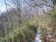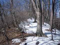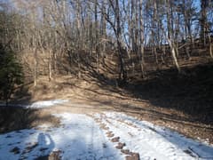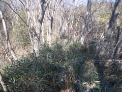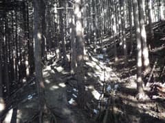 その三宝荒神に向かって雑木林の尾根を登る。尾根の左側は緩斜面だが、右側は相間川の谷に向かって意外と急な斜面となっている。