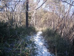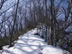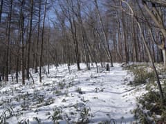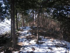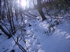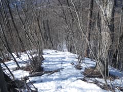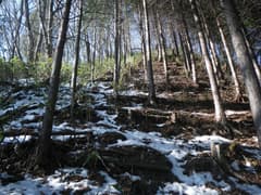 三つ丸山頂上から植林の中の作業道を下り、低木の小枝が煩い尾根を登り返す。薄く雪が積もっていて滑り易い。さらに進んで、笹藪と杉林の境界を急登する。こんな急坂があるとは、地形図からは読み取りにくい。