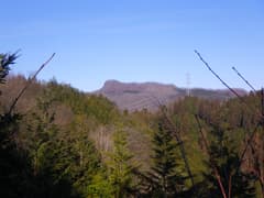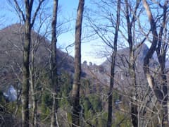 送電鉄塔から少し進んだ辺りで、木立を透かして角落山や浅間隠山が眺められる。また、角落山の左には三宝荒神岩と呼ばれる乱杭歯のような岩峰群が見える。この岩の位置は遠くて判りにくいが、これから越える三宝荒神(1316m標高点)の中腹にあるらしい。