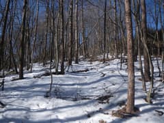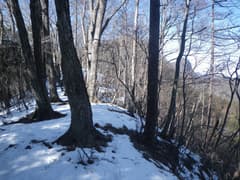 もう一段、急坂があり、笹藪を避けて雪の斜面を登る。最近、登った人があるのか、雪の上に靴の足跡が続いている。急坂の上は広くて緩い尾根で、方向を右に変える。