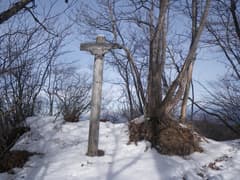 途中で右に分岐して谷に下る林道があり、分岐点に殉難の地入口を示す道標が立つ。右の林道を下って約800mの地点がその場所とのこと。立ち寄るにはちょっと距離があるので、今回は割愛する。