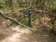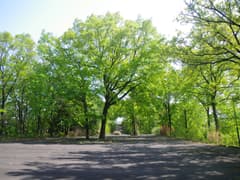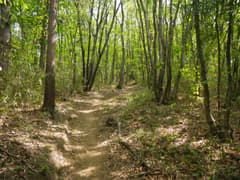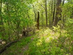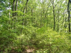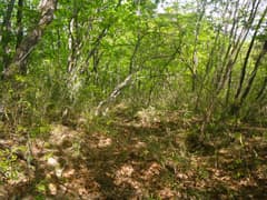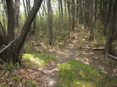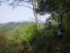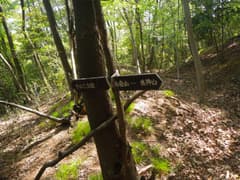 掘割状の作業道を下ると再び分岐点があるが、「きのこ会館」の道標に従う。かつてはきのこの森の散策路として整備されていたそうだが、きのこの森が廃業して久しく、整備の手も入らなくなって、歩く人も稀なようだ。雑木林の尾根の下りになると少々藪っぽい。しかし、新緑が美しく、桐生市街にほど近い場所にこんな自然の野山があったのかと、ちょっと驚く。まあ、桐生はそんな場所が多いんですがね(^^;)