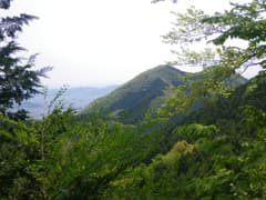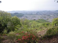 荒神山からさらに尾根を辿る。しばらく作業道を辿り、踏み跡に入る。標高が低い所は既に低木の藪が蔓延りだしているが、新緑を愛でながらまだまだ楽しんで歩ける。両側は急斜面となり、樹林を透かしてすぐ下に天神町と平井町の町並みの屋根が見える。街中に岬のように突き出た尾根の上を歩いていることが良く分かって、妙な気分だ。愛宕山頂上には三角点標石と二基の石祠があり、標高僅か166mの小山だが一丁前の山の風情である。