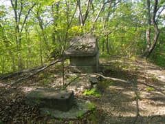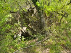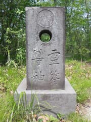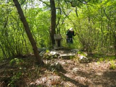頂上のすぐ先に四等三角点の標石があり、アオダモの見事な大株を過ぎて緩く下ると、霊符尊神に着く。石柱を貫通する丸い孔を覗くと駒見山が見えるとの話だが、この時期は新緑に遮られて全く見えない。北斗七星と孔の回りの瑞雲の文様がスタイリッシュな、見事な石造物だ。未見の人は是非。