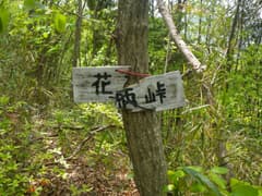 ヒノキ林と雑木林の境界の稜線を歩き、小ピークを右から巻くと、花柄峠という古い道標のある鞍部に着く。左右に峠道の痕跡が下っているが、落ち葉に覆われていて、あまり歩かれてはいないようだ。