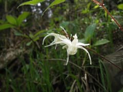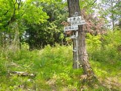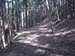この山道に入ると、暗い杉林の山腹を下る道となる。道型は明瞭だが、最近歩かれている気配がない。やがて石祠と「←きのこ会館 吾妻山 鳴神山→」という道標のあるY字路に着く。ここを右に進むと物見山に行くとのこと。左はホテルきのこの森(きのこ会館は旧称)の跡地を経由して、荒神山、愛宕山に続く稜線(桐生市史では荒神山丘陵と呼んでいる)への道だ。今日は左に進む。